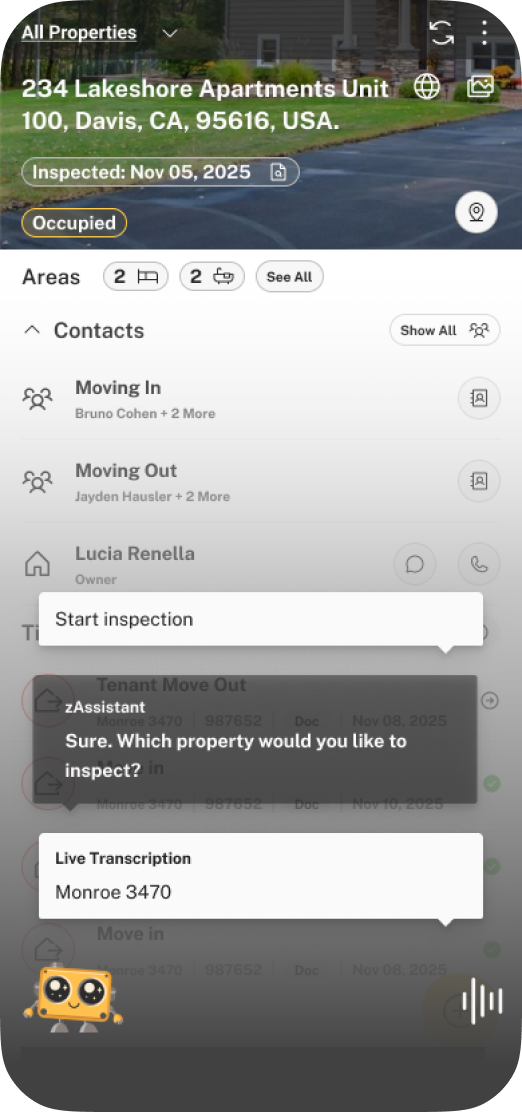 Speak naturally as you inspect. zAssistant transcribes, identifies conditions, flags action items, and generates a professional report in real time — from 2 hours to 20 minutes.