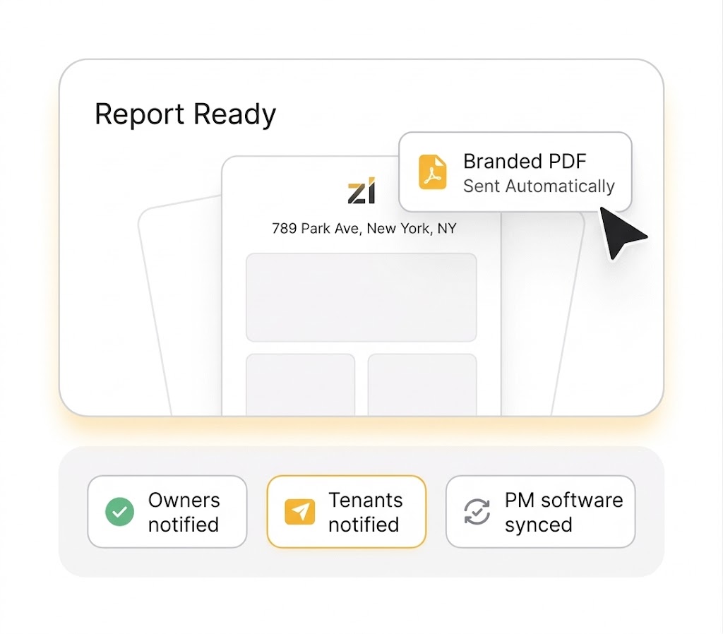 Custom cover page, white-label branding, photo layouts, and an AI-generated executive summary — emailed to owners, tenants, and your PM software the moment an inspection is submitted.